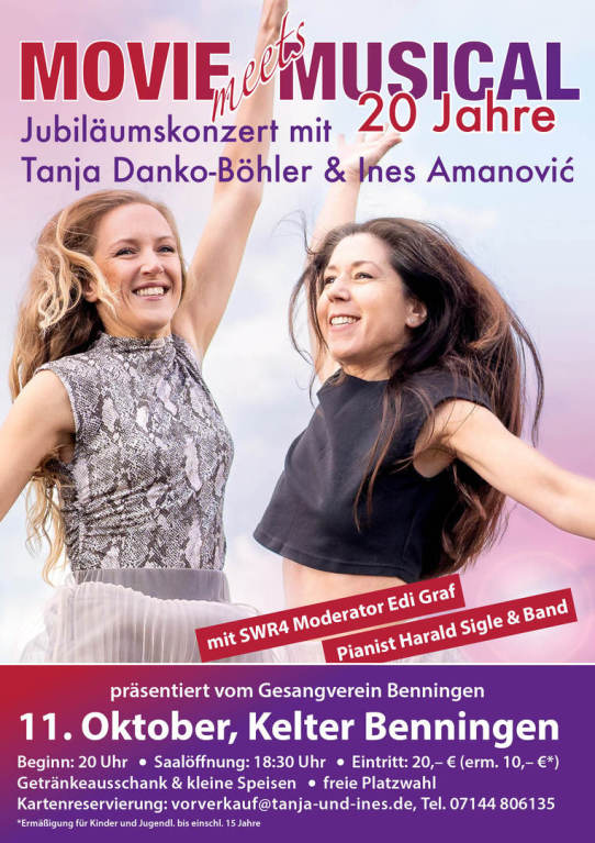 Zum zwanzigsten Mal heißt es in der Benninger Kelter "Movie meets Musical". In der großen Jubiläumsshow machen Tanja & Ines einen Steifzug durch ihre gemeinsame musikalische Vergangenheit. Seit 25 Jahren stehen die beiden Sängerinnen gemeinsam auf der Bühne und haben in dieser Zeit viele tolle Momente zusammen mit ihrem Publikum erlebt.